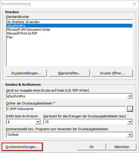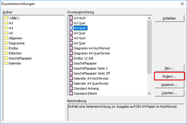 Wählen Sie die betreffende Druckereinrichtung aus und drücken die Schaltfläche . |