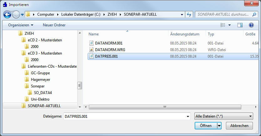 Wechseln Sie im Dateiauswahldialog in das Verzeichnis mit der von Ihrem Lieferanten erhaltenen Preisdatei im DATANORM-Format (z.B.