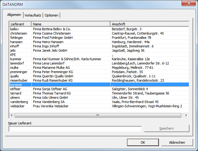 Sollte der Lieferant noch nicht existieren, kann dieser hier durch Eingabe in das Feld Neuer Lieferant angelegt werden. Es wird jedoch grundsätzlich empfohlen, neue Adressen über das Arbeitsblatt Adresse im Bereich Stammdaten der MOS'aik-Projektverwaltung anzulegen, um neben dem Kurznamen des Händlers auch alle weiteren Daten erfassen zu können.Auf der Registerkarte Vorlaufsatz erhalten Sie außerdem Informationen zur gewählten DATANORM-Datei.