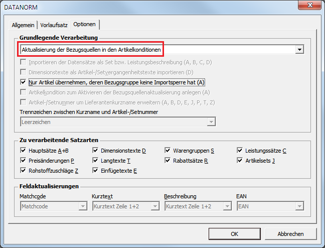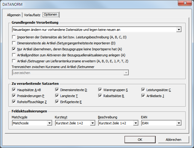Falls Sie Importsperren für Warengruppen einsetzen (siehe DATANORM), sollten Sie hier außerdem den Schalter Nur Artikel übernehmen, deren Bezugsgruppe keine Importsperre hat (A) auswählen.