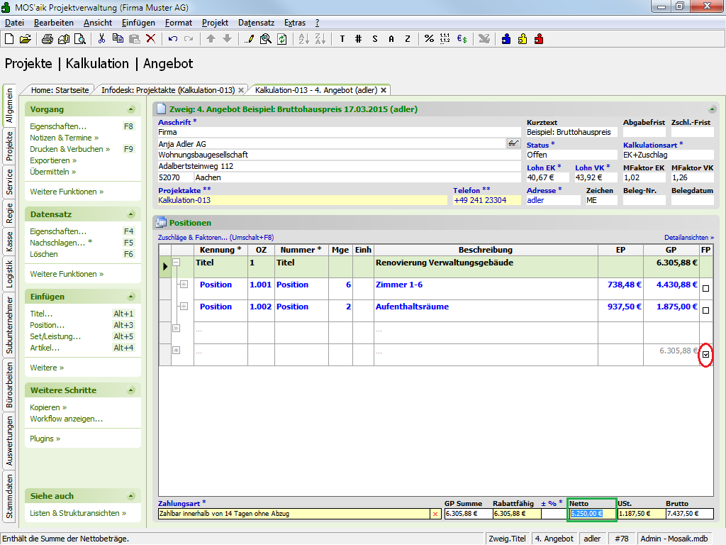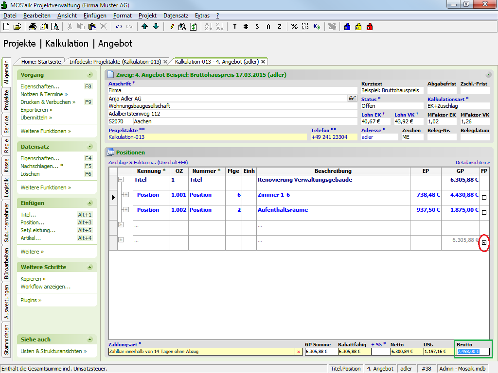Brutto-Festpreis mit Rückrechnung über Projekt Ab-/Zuschlag) kann durch direkte