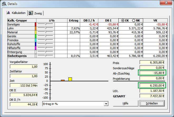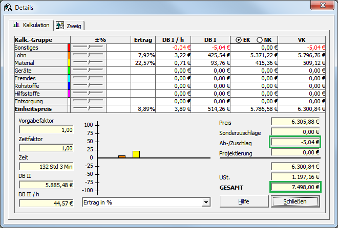 In den Kalkulationsdetails wird außerdem der daraus resultierende Ab-/Zuschlag ausgegeben:Abbildung 5.12. Ab-/Zuschlag (Detailfenster)