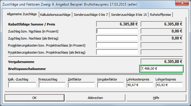 Im Dialog Zuschläge & Faktoren ... (Umschalt+F8) schlägt sich die Änderung in der Bruttopauschalsumme nieder:Abbildung 5.13. Ab-/Zuschlag (Detailfenster)