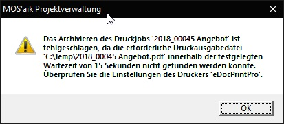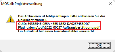 Falls beim Vorgangsdruck eine PDF-Datei erzeugt wurde, diese aber nicht in ecoDMS archiviert werden konnte, wird eine entsprechende Meldung mit der MOS'aik Druck GUID, sowie dem Pfad der zu archivierenden Datei erzeugt. Mögliche Fehlerursachen: