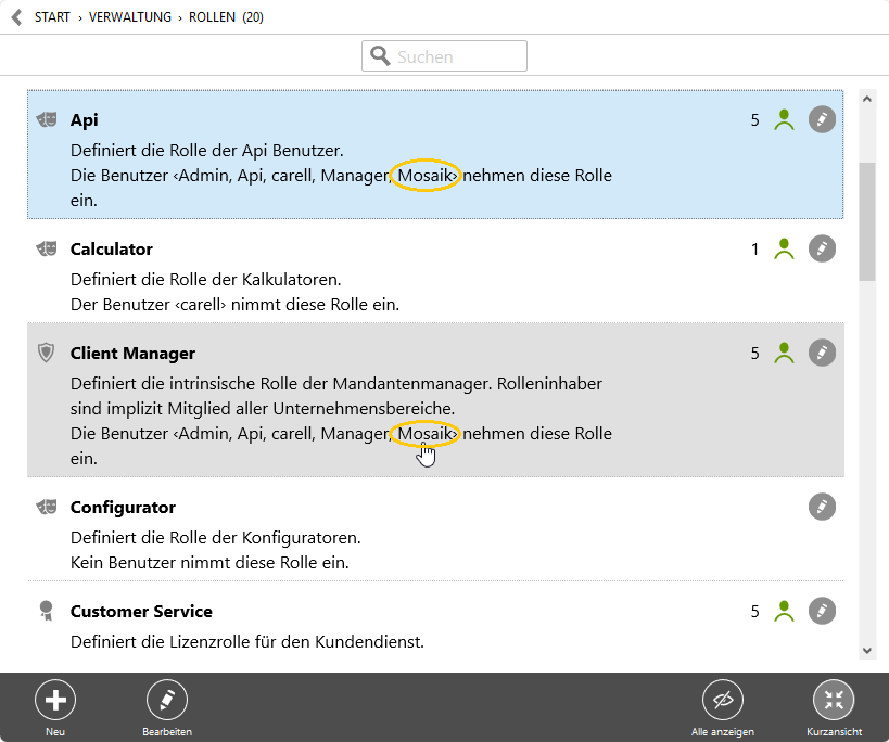 Prüfen Sie im Arbeitsblatt , dass der Benutzer Mosaik über die Rolle Api verfügt: