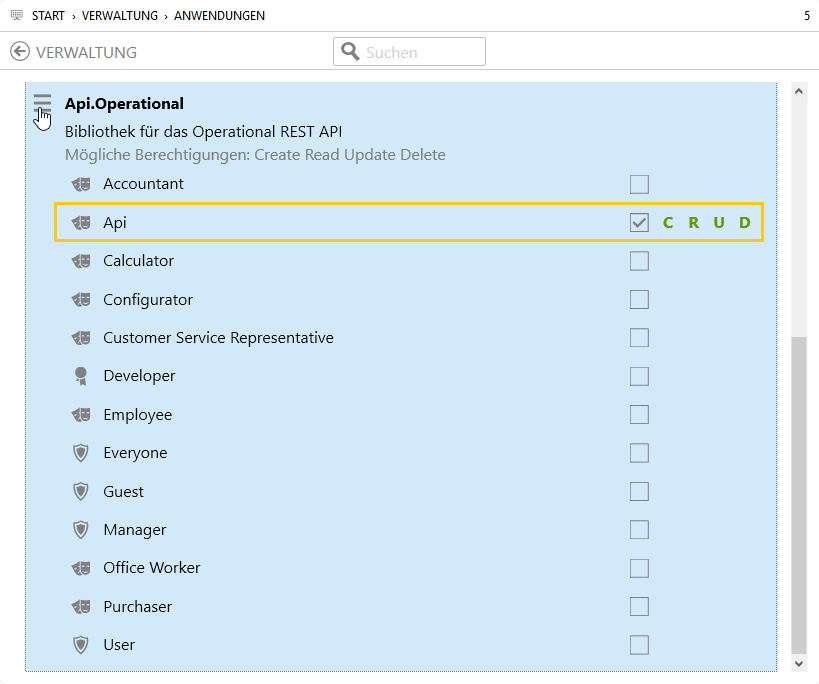 Wählen Sie die Bibliothek "Api.Operational" an und stellen Sie sicher, dass für die Rolle Api ein Häkchen gesetzt ist und die erforderlichen Berechtigungen als grüne Buchstaben angezeigt werden (siehe auch Abschnitt 25.2, „Rollen“):