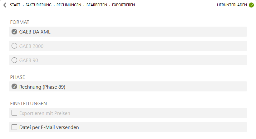 Um eine Rechnung im Format GAEB x89 zu erstellen, öffnen Sie zunächst Ihren Rechnungsvorgang. Sollte die Rechnung noch nicht verbucht sein, muss diese zunächst gebucht werden. Wechseln Sie dann zu den Vorgangseigenschaften und wählen Sie über das . Setzen Sie die Häkchen für die Auswahl und und legen Sie optional fest, ob Sie die Datei per E-Mail versenden (siehe Abschnitt 25.16, „E-Mail-Server“) oder herunterladen möchten. Berechtigungen