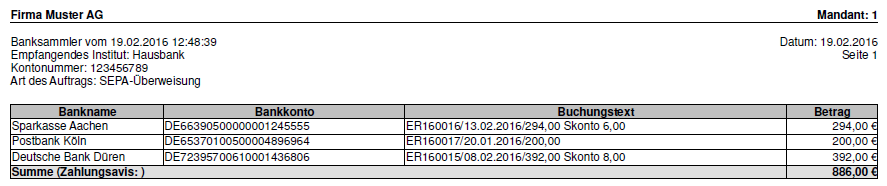 Zahlungsaviszur Verfügung. Diese enthält bei Verwendung der Export-Einstellung "Alle Zahlungen in einer Sammelbuchung kumulieren" den Kurznamen der Adresse und ermöglicht so eine Gruppierung. Nach dem Export von Überweisungen kann damit eine Übersicht der Zahlungen, z.B. für einzelne Lieferanten, gedruckt werden! -