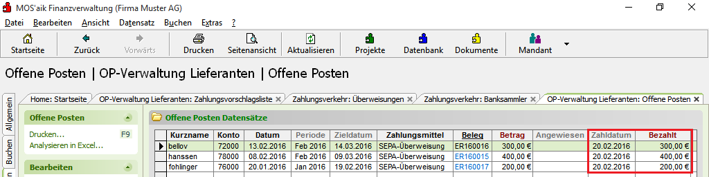 Wenn Sie vor der Erstellung der Bankdatei bei der Hausbank (siehe Abschnitt 2.2, „Einstellungen in den Bankkonten“) das Feld Zahlungsverbuchung auf Beim Export eingestellt haben, werden die OPs beim Erstellen der Bankdatei sofort ausgeglichen bzw. als bezahlt gebucht: