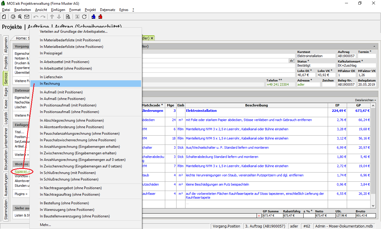 Verwenden Sie die Funktion Kopieren » In Rechnung, um den Auftrag in eine Rechnung zu kopieren.