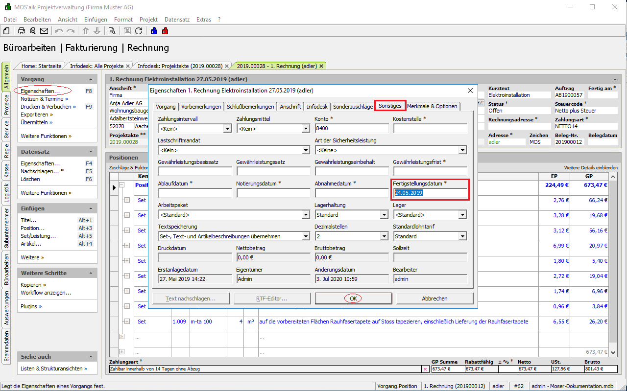 Geben Sie das Datum im Feld Fertigstellungsdatum ein und bestätigen Sie mit OK.