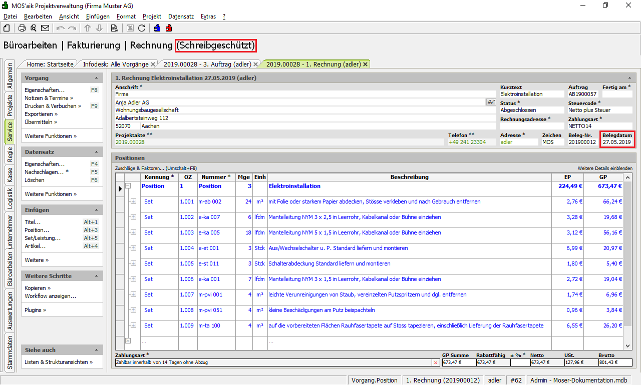 Die Rechnung wird erstellt. Dabei bleiben sämtliche Einstellungen, die bereits im Quellvorgang (Auftrag) vorgenommen wurden, erhalten.