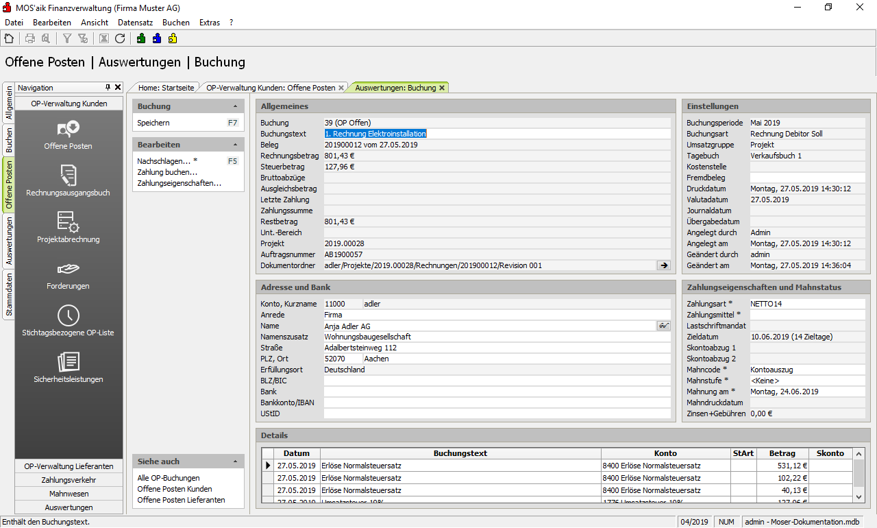 Beim Druck der Rechnung werden von MOS'aik zahlreiche Buchungen durchgeführt. So werden z.B. Umsatzstatistiken für Kunden und Artikel geschrieben. Zur Kontrolle der Rechnungen wird ein Offener Posten (OP) angelegt, der z.B. (ggf. nach dem Verbuchen des Buchungsstapels) in der MOS'aik-Finanzverwaltung