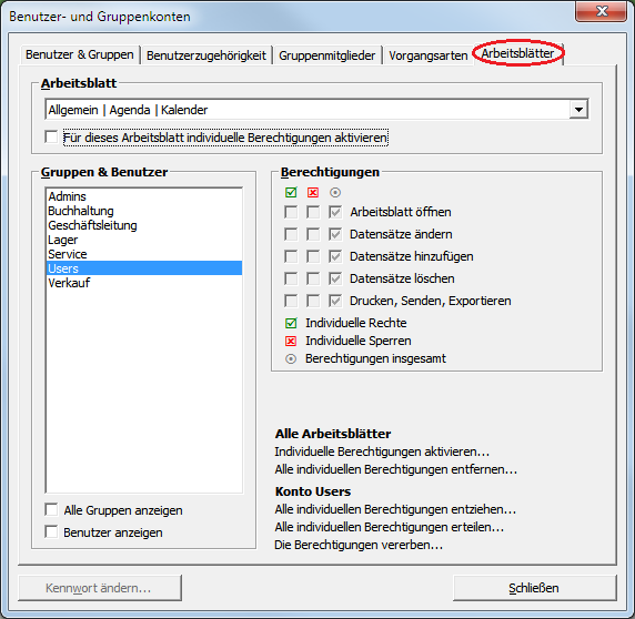 Melden Sie sich als Administrator an (z.B. admin) und wählen das Menü Extras > Benutzer- und Gruppenkonten. Klicken Sie auf die Registerkarte Arbeitsblätter. |