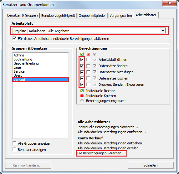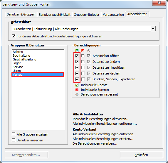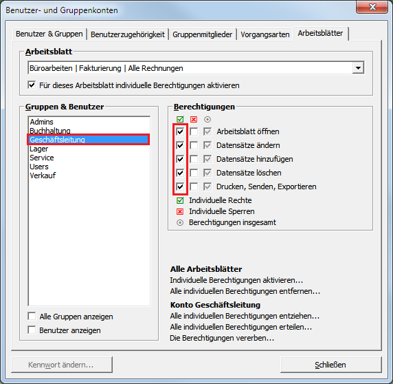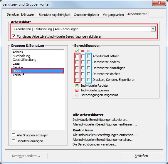 Wählen Sie im Bereich Arbeitsblatt Büroarbeiten | Fakturierung | Alle Rechnungen aus und setzen Sie das Häkchen vor Für dieses Arbeitsblatt individuelle Berechtigungen aktivieren. Damit wird für alle Gruppen und Benutzer (außer den Administratoren) sämtliche Zugriffsberechtigungen für dieses Arbeitsblatt entfernt (siehe blaue Markierung)! Wählen Sie dann im Bereich