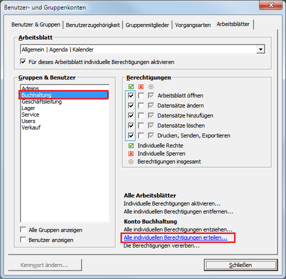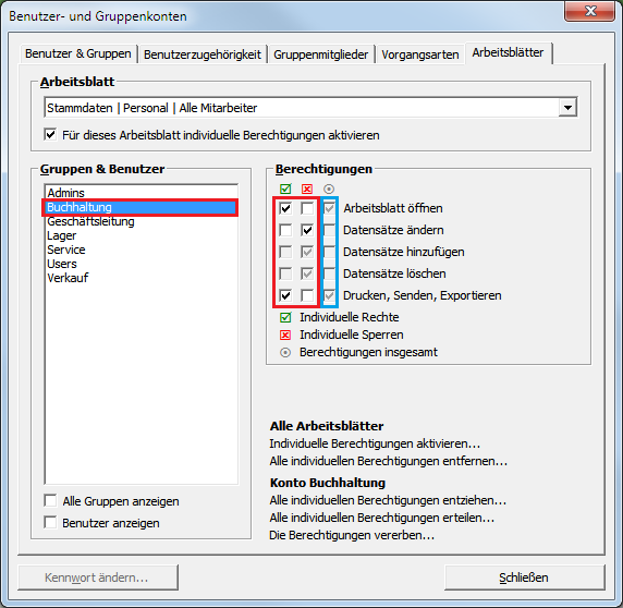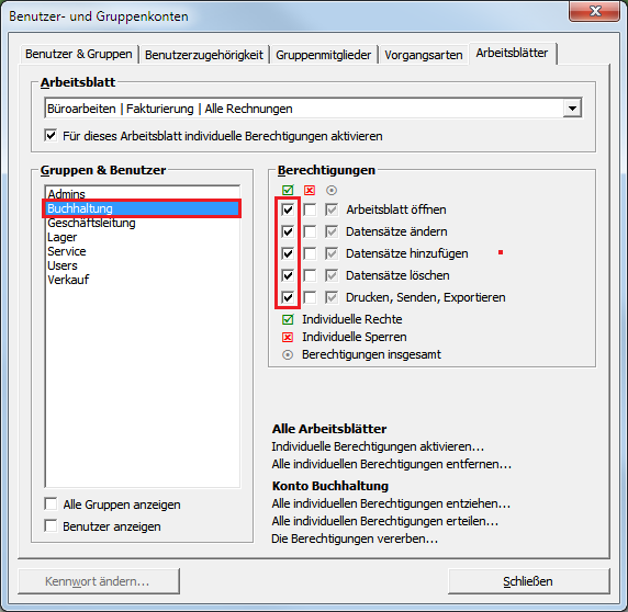 Wählen Sie nun die Abteilung Buchhaltung aus. Da diese Abteilung weitreichende Befugnisse im Betrieb haben soll, rufen Sie die Funktion Konto Buchhaltung Alle individuellen Berechtigungen erteilen ... auf. Damit erhält die Gruppe zunächst den Vollzugriff auf alle Arbeitsblätter. Sie können nun die einzelnen Arbeitsblätter im Bereich Arbeitsblatt durchgehen und die Berechtigungen der Buchhaltung für jedes Arbeitsblatt prüfen und ggf. entziehen. |