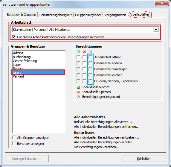 Wählen Sie im Bereich Arbeitsblatt Stammdaten | Personal | Alle Mitarbeiter aus und setzen Sie das Häkchen vor Für dieses Arbeitsblatt individuelle Berechtigungen aktivieren. Damit wird für alle Gruppen und Benutzer (außer den Administratoren) sämtliche Zugriffsberechtigungen für dieses Arbeitsblatt entfernt (siehe blaue Markierung)! Wählen Sie im Bereich