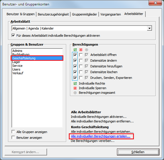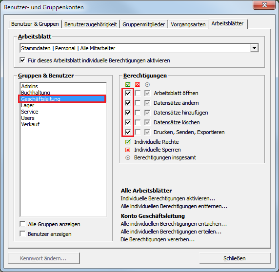 Wählen Sie nun die Abteilung Geschäftsleitung aus. Da diese Abteilung alle Befugnisse im Betrieb haben soll, rufen Sie auch hier die Funktion Konto Buchhaltung Alle individuellen Berechtigungen erteilen ... auf. Damit erhält die Geschäftsleitung den Vollzugriff auf alle Arbeitsblätter. Sie können jedoch jetzt noch einzelne, nicht verwendete Arbeitsblätter im Bereich Arbeitsblatt durchgehen und die Berechtigungen entziehen, um diese Arbeitsblätter auf der Programmoberfläche der Geschäftsleitung auszublenden. |
