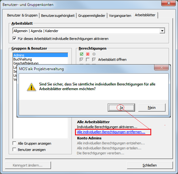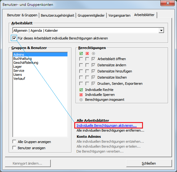 Durch Aufruf der Funktion Alle ArbeitsblätterIndividuelle Berechtigungen aktivieren ... werden die Häkchen Für dieses Arbeitsblatt individuelle Berechtigungen aktivieren für alle Arbeitsblätter gesetzt. |
