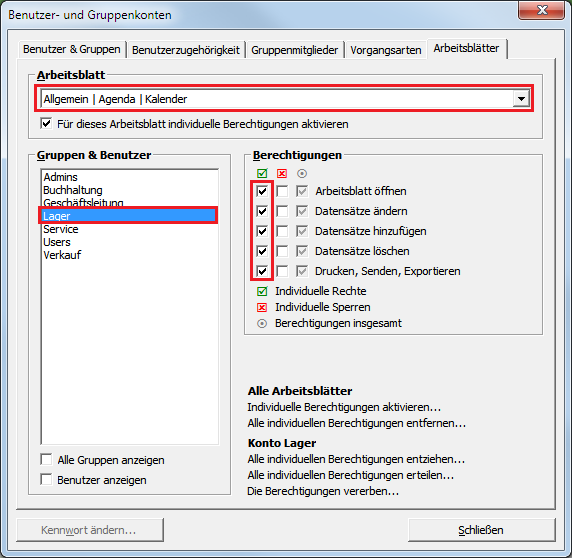 Die Abteilung Lager benötigt in diesem Betrieb nur wenige Zugriffsrechte. Aus diesem Grund ordnen Sie der Gruppe diese Arbeitsblätter (z.B. Allgemein | Agenda | Kalender) einzeln zu, indem Sie die Gruppe markieren, ein Arbeitsblatt für die Zugriffsfreigabe im Bereich Arbeitsblatt auswählen und dann die Berechtigungen einzeln hinzufügen. Fahren Sie entsprechend mit weiteren Arbeitsblättern, wie z.B. Allgemein | Home | Internet, Allgemein | Home | Handbuch und aus dem Bereich Logistik | Lagerverwaltung fort. |