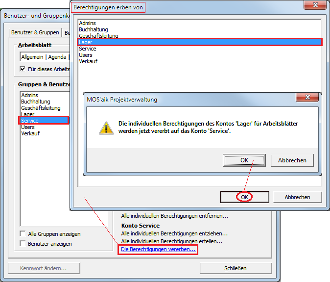 Die Abteilung Service benötigt ebenfalls nur bestimmte Zugriffsrechte, z.B. für den Bereich Service. Es sollen jedoch auch die Rechte der Abteilung Lager verfügbar sein. Dazu vererben Sie zunächst die Rechte der Abteilung Lager an die Abteilung Service, indem Sie die Gruppe Service auswählen und die Funktion Konto Lager Die Berechtigungen vererben ... aufrufen und die Gruppe Lager zuordnen ... |