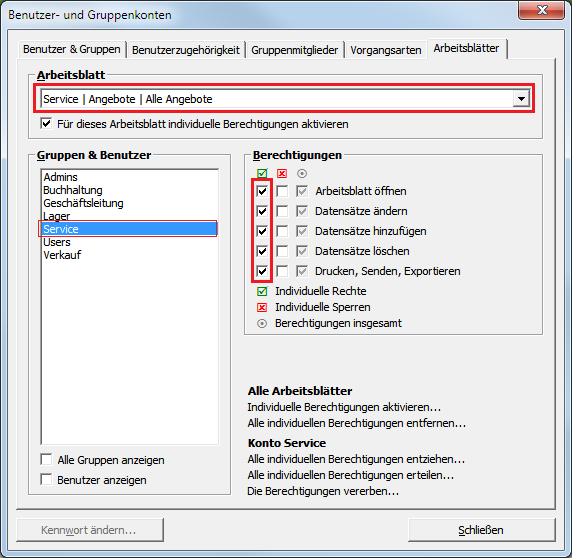 Die Abteilung Service hat nun dieselben Zugriffsrechte wie die Gruppe Lager. Zusätzlich benötigt sie jedoch noch die Rechte für den Bereich Service | . ... Dazu wählen Sie nun nacheinander die