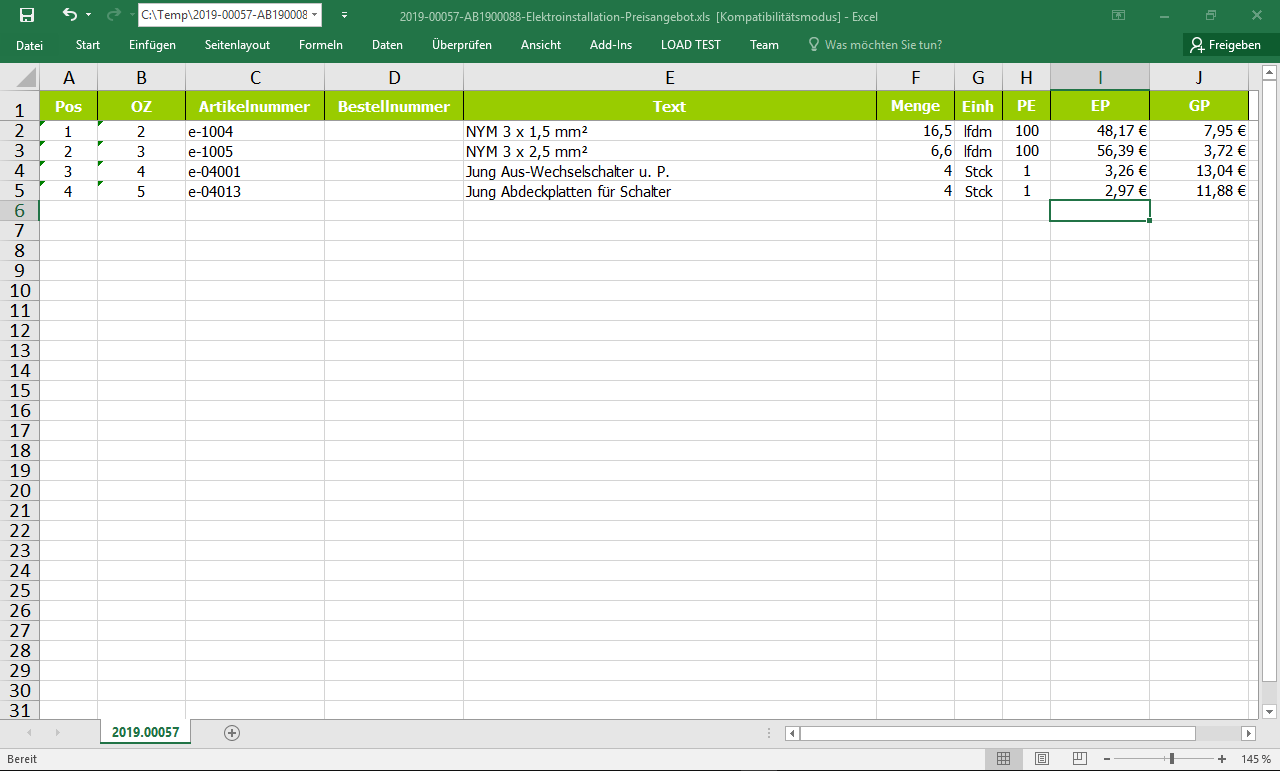 Ein von Ihrem Lieferanten erhaltenes Preisangebot (im Beispiel als Excel®-Datei).