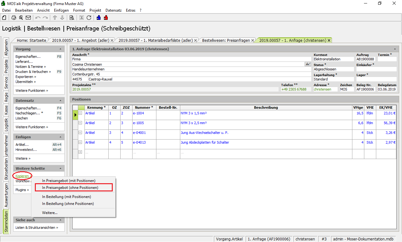Öffnen und Kopieren Sie zunächst die vorausgegangene Preisanfrage in ein neues Preisangebot (ohne Positionen).