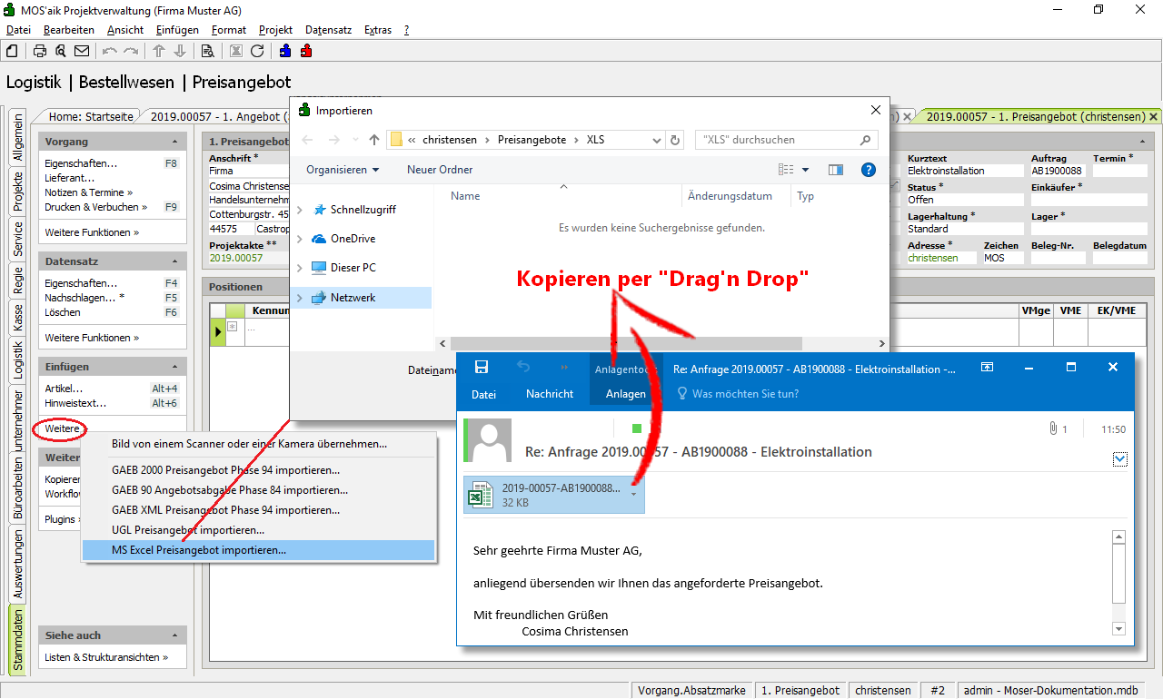 Das z.B. per E-Mail empfangene Preisangebot des Lieferanten liegt jedoch typischerweise noch nicht in diesem Verzeichnis. In diesem Fall öffnen Sie die erhaltene E-Mail und kopieren Sie den Dateianhang per "Drag & Drop" in den geöffneten Ordner.
