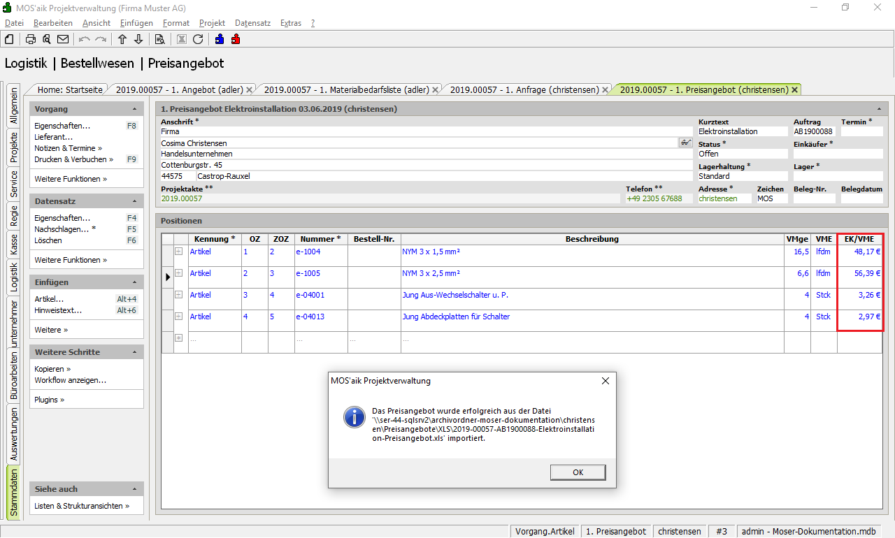 Das Preisangebot wurde in den Vorgang importiert.