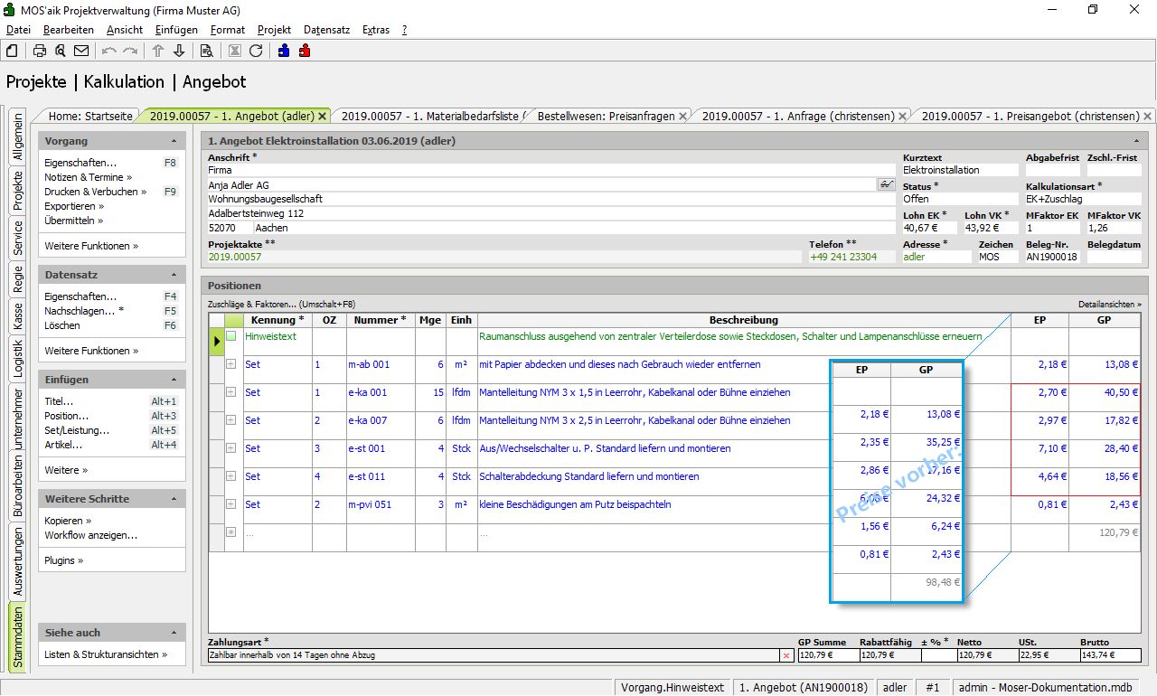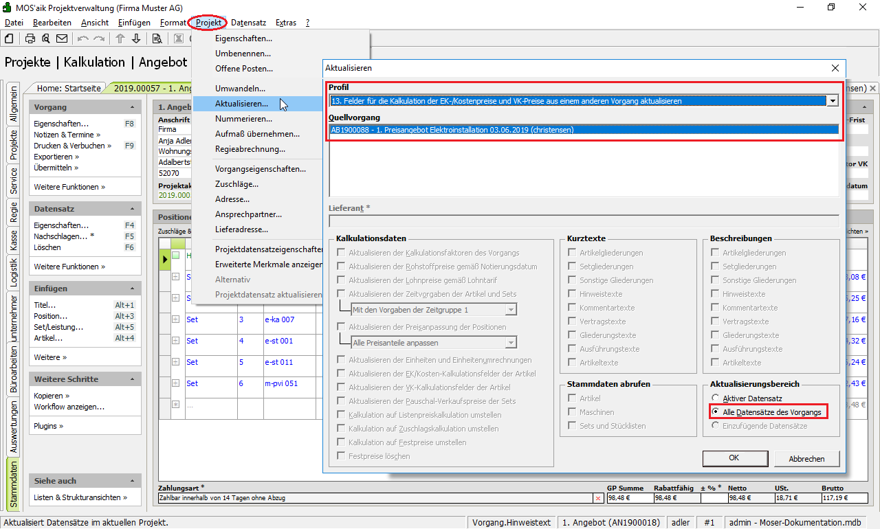 Um das erhaltene Preisangebot nun in das Kundenangebot zu übernehmen, öffnen Sie zunächst den Kundenvorgang (siehe Beispiel Abschnitt 4.8.1, „Materialbedarfsliste erstellen“) und wählen Sie aus dem Menü Projekt > Aktualisieren.