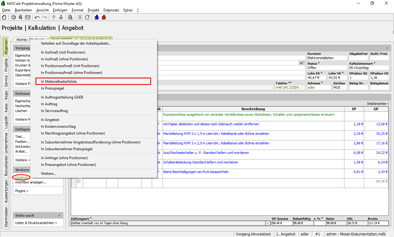 Im Folgenden erfahren Sie, wie eine Materialbedarfsliste aus einem Angebot