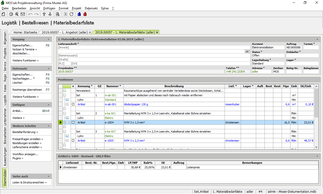 Materialbedarfslisten stellen in MOS'aik die Verbindung zwischen kundenseitigen und lieferantenseitigen
