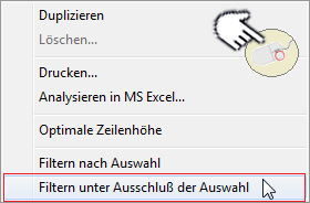 | Darüber hinaus können Sie auch mehrere beliebige Datensätze markieren (z.B. Strg+Mausklick oder Umschalt+Mausklick) und anschließend darauf mit der rechten Maustaste im Kontextmenü den Punkt wählen, um die ausgewählten Datensätze aus der Listenansicht auszublenden. Alle nicht markierten Tabelleneinträge bleiben sichtbar. |