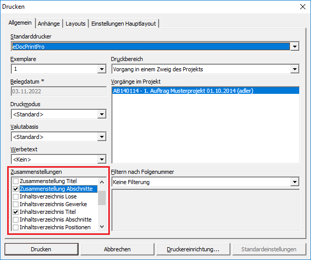 Zusammenstellungen werden dabei grundsätzlich den Vorgangsseiten angehängt. Zum Druck müssen Sie dazu eine verfügbare Seitenauswahl mit Seite 1 ff. auf der Registerkarte Einstellungen Hauptlayout des Druckdialogs wählen (Standardvorgabe).