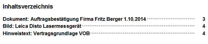 Texte, Bilder und Objekte im InhaltsverzeichnisSie können übrigens auch Texte (z.B. allgemeine Geschäftsbedingungen), Bilder (Pläne, Skizzen etc.) oder sonstige Objekte, wie z.B. angefügte Office-Dokumente, mit ihrerKennung, demKurztextbzw. alternativ derBeschreibungin einem Inhaltsverzeichnis aufnehmen, indem Sie die Absatzeigenschaften entsprechend einstellen.Abbildung 6.36. Beispiel