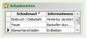 | In diesem Bereich können die für die Schadenakte relevanten Schadenarten hinterlegt werden (siehe Abschnitt 3.3, „Schadenarten“). |