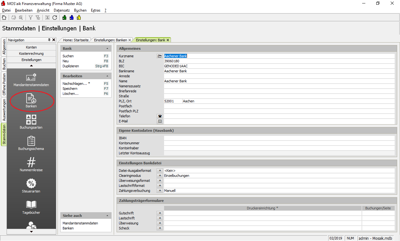Wählen Sie eine Bank aus, um diese zu bearbeiten und tragen Sie die Bankverbindung in dem Bereich Eigene Kontodaten (Hausbank) ein: