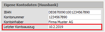 KontoauszugspositionundKontoauszugsdatumzur Verfügung, die beim Import von MT940-Kontoauszugsdateien aktualisiert (siehe Abschnitt 7.1.5, „Kasse/Bank“) und zum Abgleich eingesetzt werden. Das letzte Kontoauszugsdatum wird außerdem im Arbeitsblatt der Bank im Bereich Eigene Kontodaten (Hausbank) (s. Feld Letzter Kontoauszug) angezeigt:Abbildung 8.78. Letzter Kontoauszug