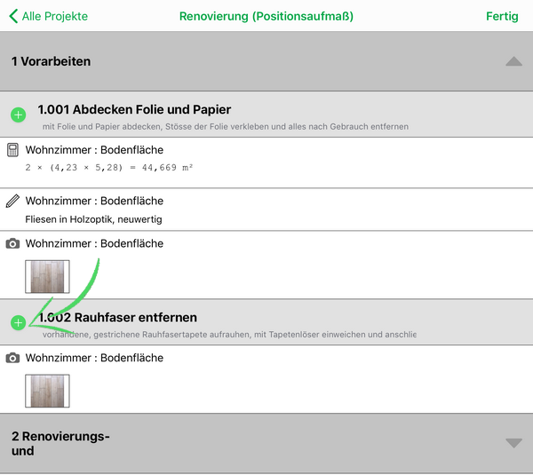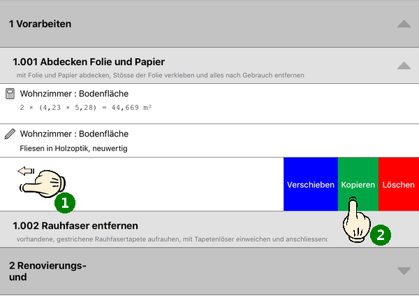 In der Positionsansicht können Sie außerdem Massenansätze oder Positionen kopieren, indem Sie diese einfach mit dem Finger oder Touch-Pen an den linken Bildschirmrand schieben und die Schaltfläche Kopieren wählen. Anschließend fügen Sie den Datensatz durch Auswahl des