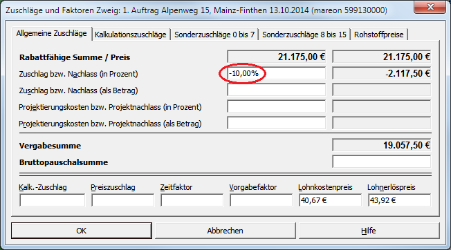Das FeldPreiszuschlag %(bzw. alternativ die SpaltePZ %) beinhaltet einen verdeckten Preiszu- oder -abschlag (siehe Kalkulation). Das FeldAb-/Zuschlag %(bzw. alternativ die Spalte±%) beinhaltet einen offenen Preisab- oder -zuschlag (siehe Kalkulation).Rabatte und ZuschlägeBeachten Sie, dass für Mareon-Aufträge Rabatte/Zuschläge nur entweder in den "Zuschlägen und Faktoren" oder in den Positionseigenschaften eingestellt werden dürfen! Wenn im Vorgang ein Grundrabatt vereinbart wurde, so wird dieser für alle Positionen verwendet; ohne Grundrabatt werden ggf. vorhandene Positionsrabatte berücksichtigt.[79]