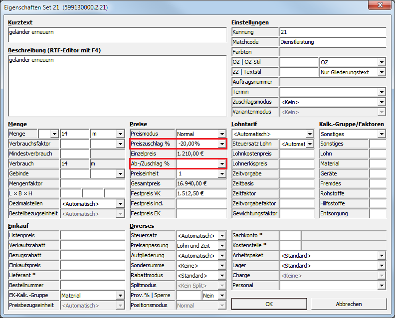 Eigenschaftender erfassten Leistungen bzw. Artikel (Positionen) erfassen:Abbildung 1.39. Zuschläge und Faktoren