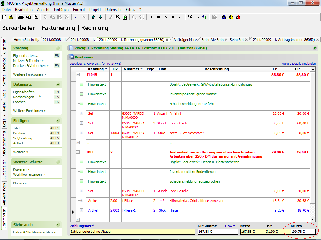 Beispiel 1.1. Rechnung aus einem Standard-AuftragErfassen Sie zu der jeweiligen Position die erbrachten Leistungen, indem Sie z.B. die Leistungen aus dem Leistungsverzeichnis des betreffenden Wohnungsunternehmens einfügen.