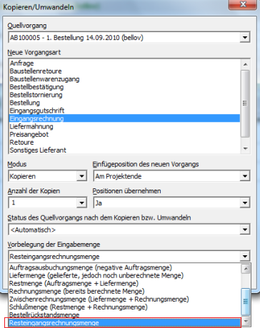 Beim Kopieren einer Bestellung in eine Eingangsrechnung wird beim Einstellen der Mengenübernahme auf "Automatisch" die "Resteingangsrechnungsmenge" übernommen.