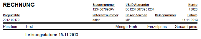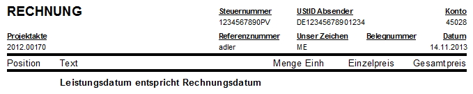 Wenn kein Fertigstellungsdatum im Vorgangskopf hinterlegt ist, erscheint unterhalb des Seitenkopfes der 1. Seite der Text "Leistungsdatum entspricht Rechnungsdatum" (für Rechnungen und Gutschriften):Abbildung 6.47. Rechnungsdruck erbrachte Leistungen (ohne Fertigstellungsdatum)
