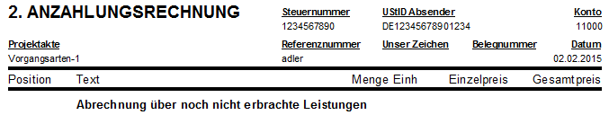 Für die Vorgangsarten Akontoanforderung, Anzahlungsrechnung und Pauschalanzahlungsrechnung erfolgt an dieser Stelle der Hinweis "Abrechnung über noch nicht erbrachte Leistungen":