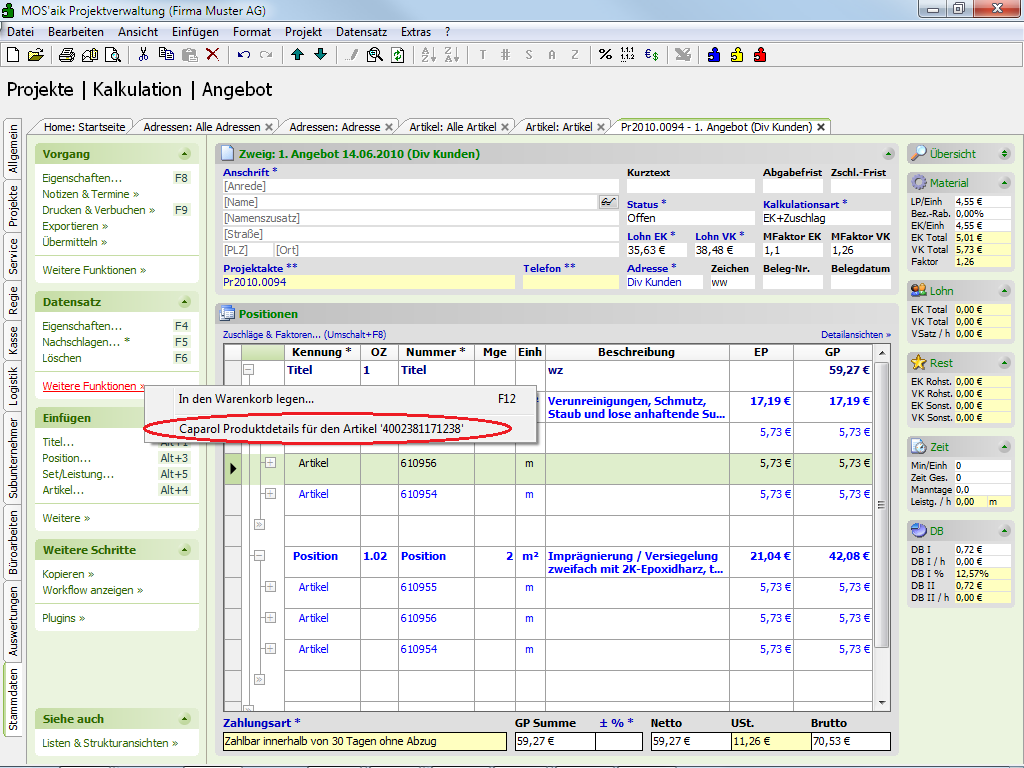 Weitere Funktionen »klicken. Im Menü steht Ihnen dann die Funktion zur Verfügung:Abbildung 3.25. Caparol Produktdetails (Vorgangsansicht)