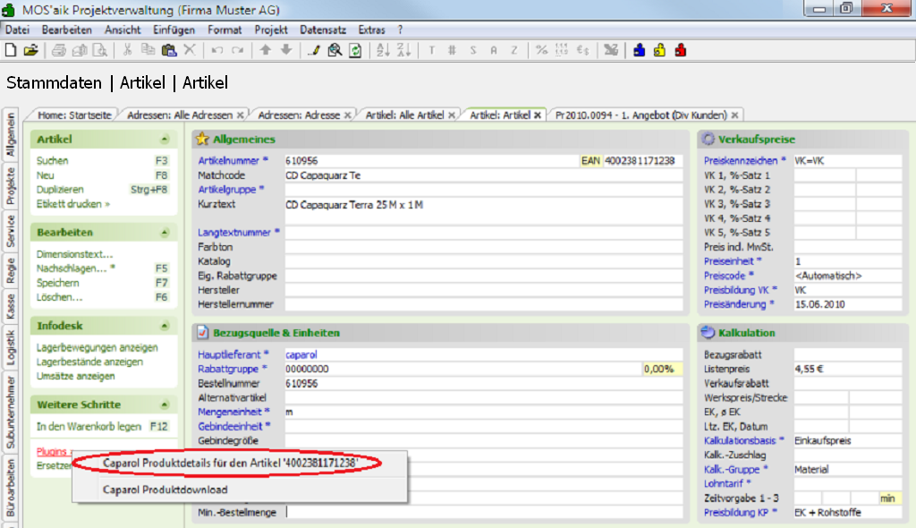Plugins »für den aktuell geöffneten Artikel zur Verfügung:Abbildung 3.26. Caparol Produktdetails (Artikelstammdaten)