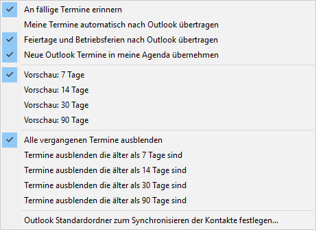 Die Funktion Agenda Optionen » bietet Ihnen folgende Einstellmöglichkeiten, die Sie durch Anklicken an- und abwählen können: