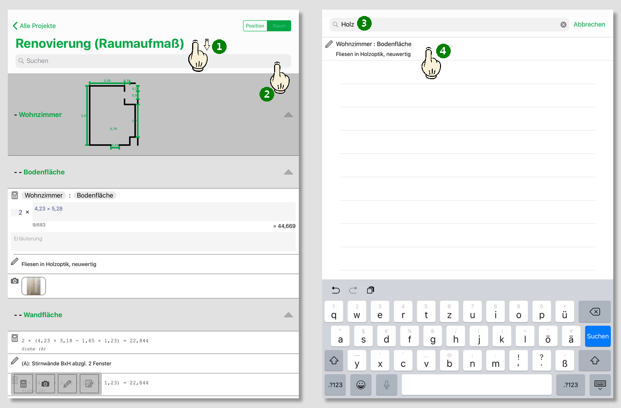 In umfangreichen Leistungsverzeichnissen oder beim Aufmessen zahlreicher Räume oder Bauteile kann man Datensätze mit der Suchfunktion schnell wiederfinden.